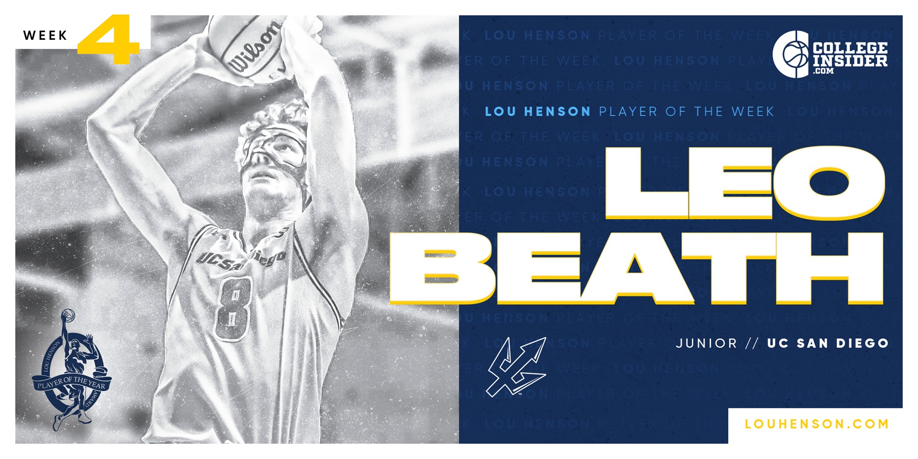 BOSTON, MA -- UC San Diego’s Leo Beath has been named the Lou Henson award National Player of the Week. The 6-foot-8 junior led the Tritons to a perfect 3-0 week.