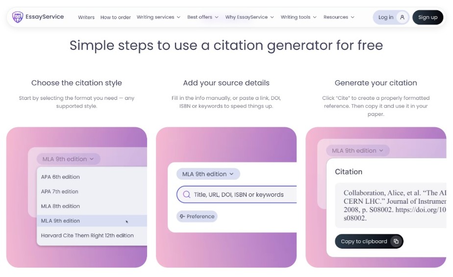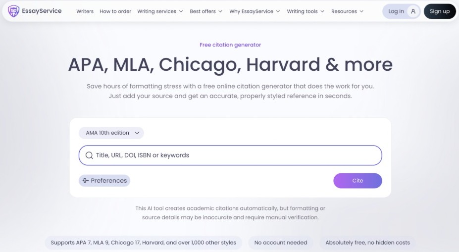 The free citation generator by EssayService is accurate, fast, and eliminates one of the biggest academic frustrations. Instead of stressing over commas and italics, students can now trust their references to be correct and updated. According to many reviews, it’s a tool that genuinely makes a difference. Focus on writing your best essay - let EssayService handle the citations.