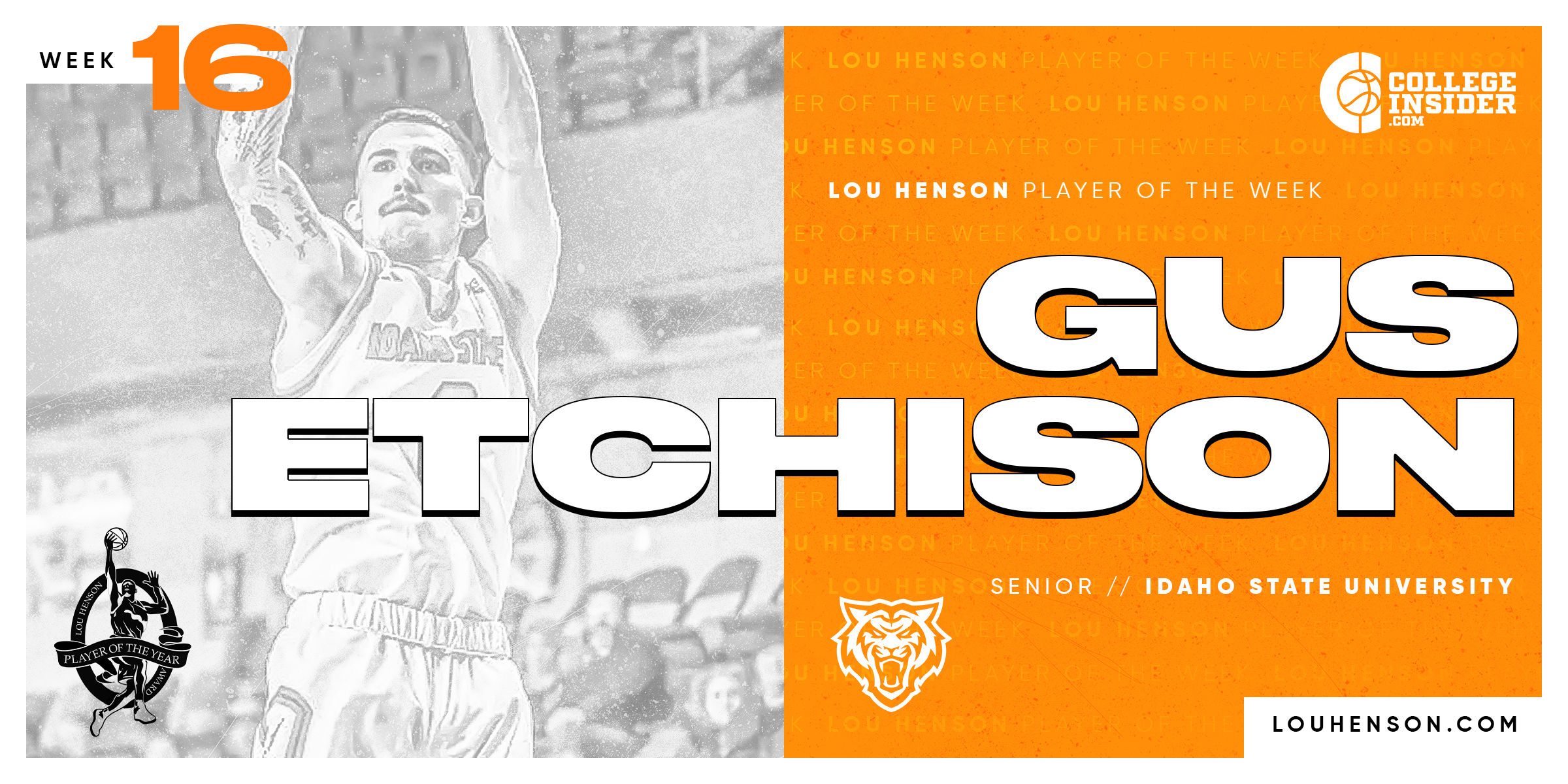 BOSTON, MA -- Idaho State’s Gus Etchison has been named the Lou Henson award National Player of the Week. The 5-foot-11 senior led the Bengals to a pair of conference wins last week.