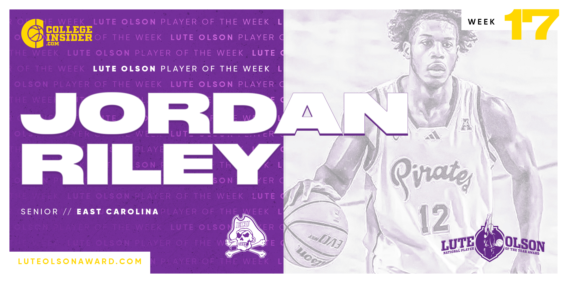 BOSTON, MA -- East Carolina’s Jordan Riley has been named the Lute Olson award National Player of the Week. The 6-foot-5 senior helped the Pirates to a pair of conference wins last week.
