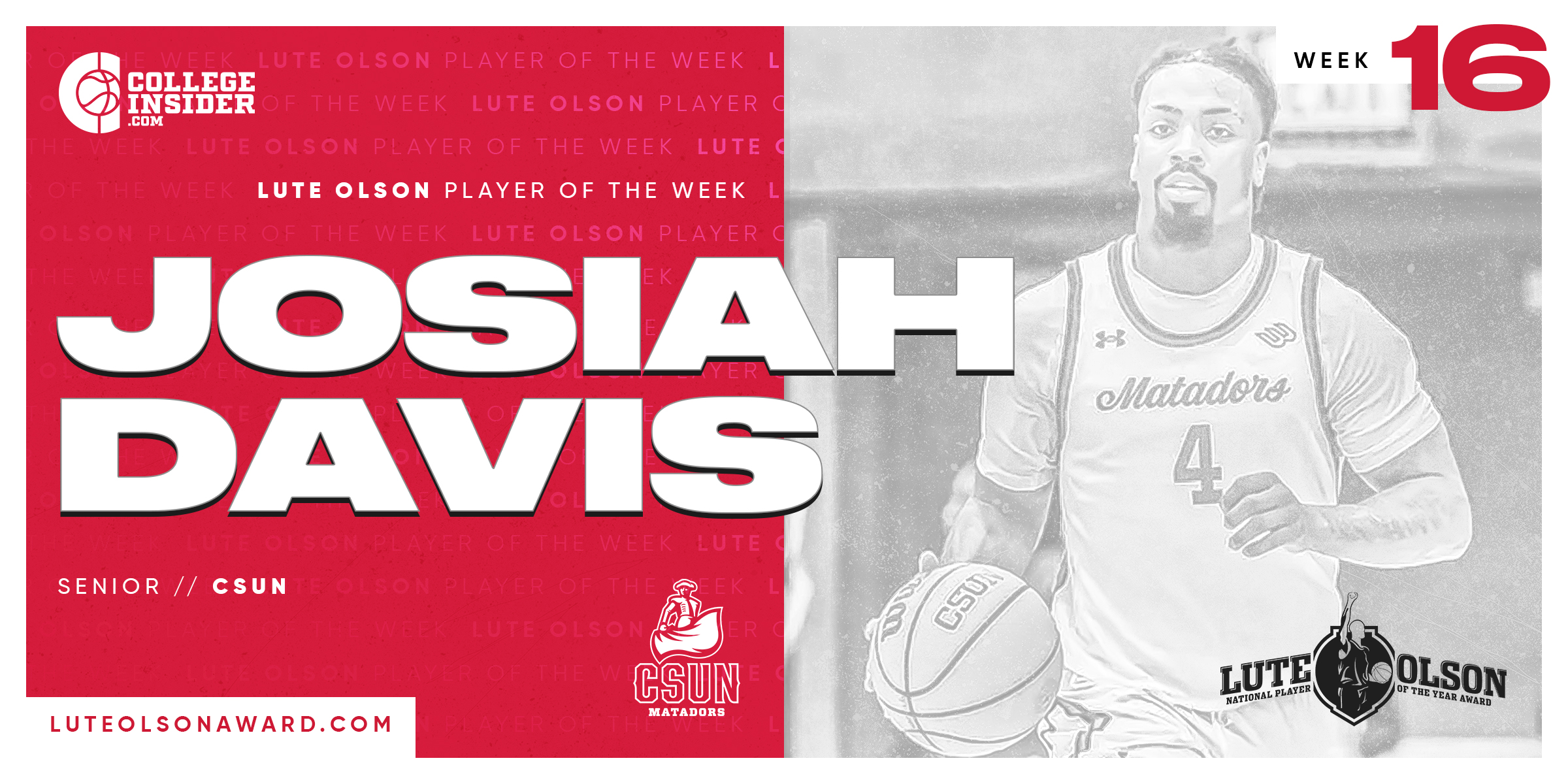 BOSTON, MA -- CSUN’s Josiah Davis has been named the Lute Olson award National Player of the Week. The 6-foot-3 senior helped the Matadors to a pair of conference road wins last week.