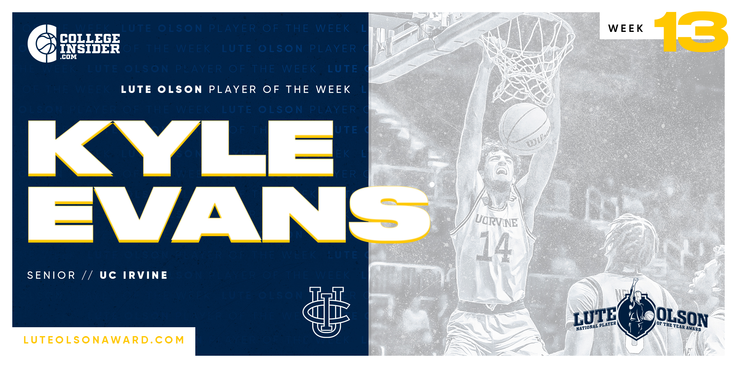 BOSTON, MA -- UC Irvine’s Kyle Evans has been named the Lute Olson award National Player of the Week. The 6-foot-10 senior helped the Anteaters to a big win over Hawaii in the first-place showdown in the Big West Conference.