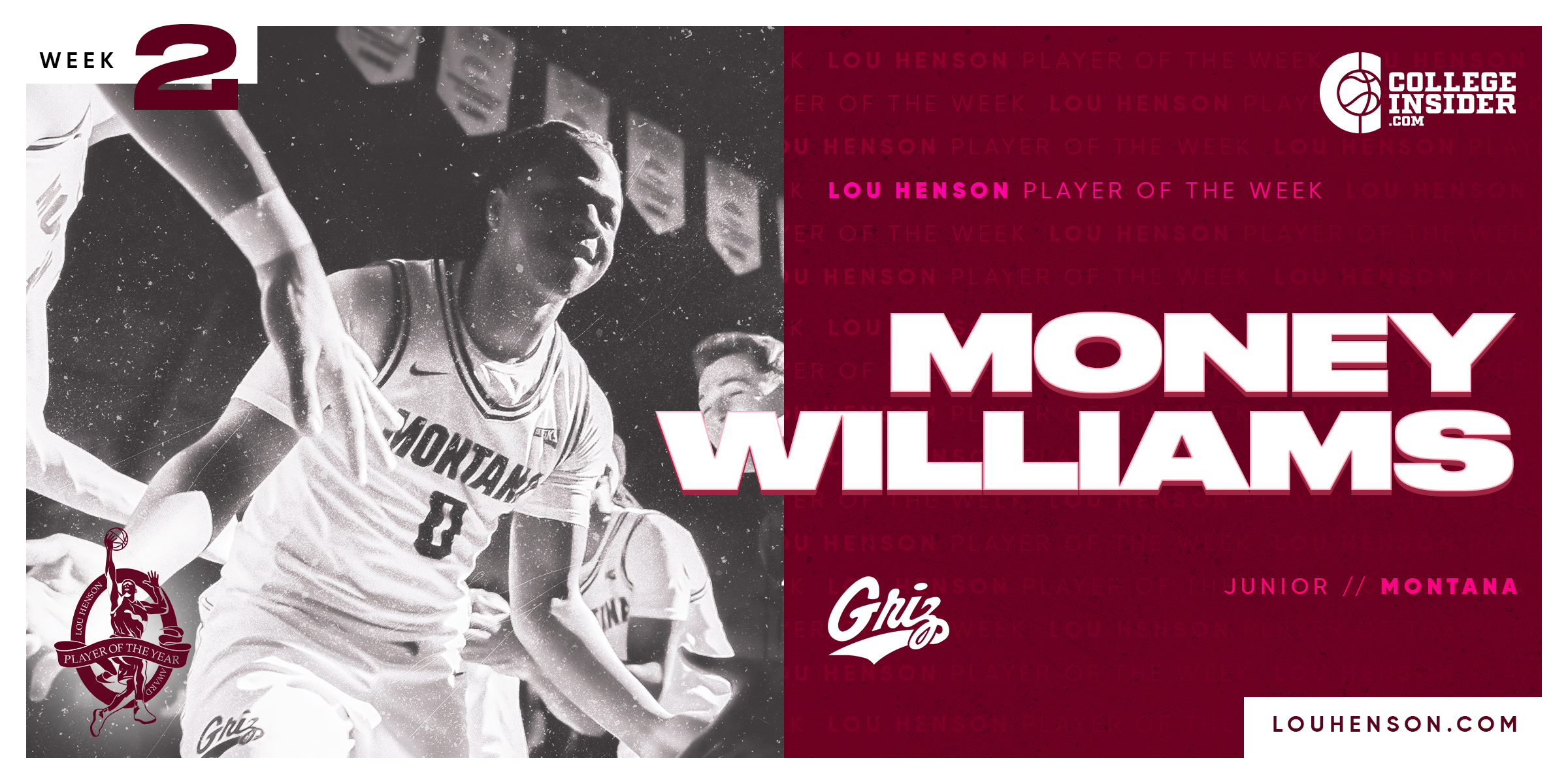 BOSTON, MA -- Montana's Money Williams has been named the Lou Henson award National Player of the Week. The 6-foot-4 junior led the Grizzlies to a pair of wins last week.