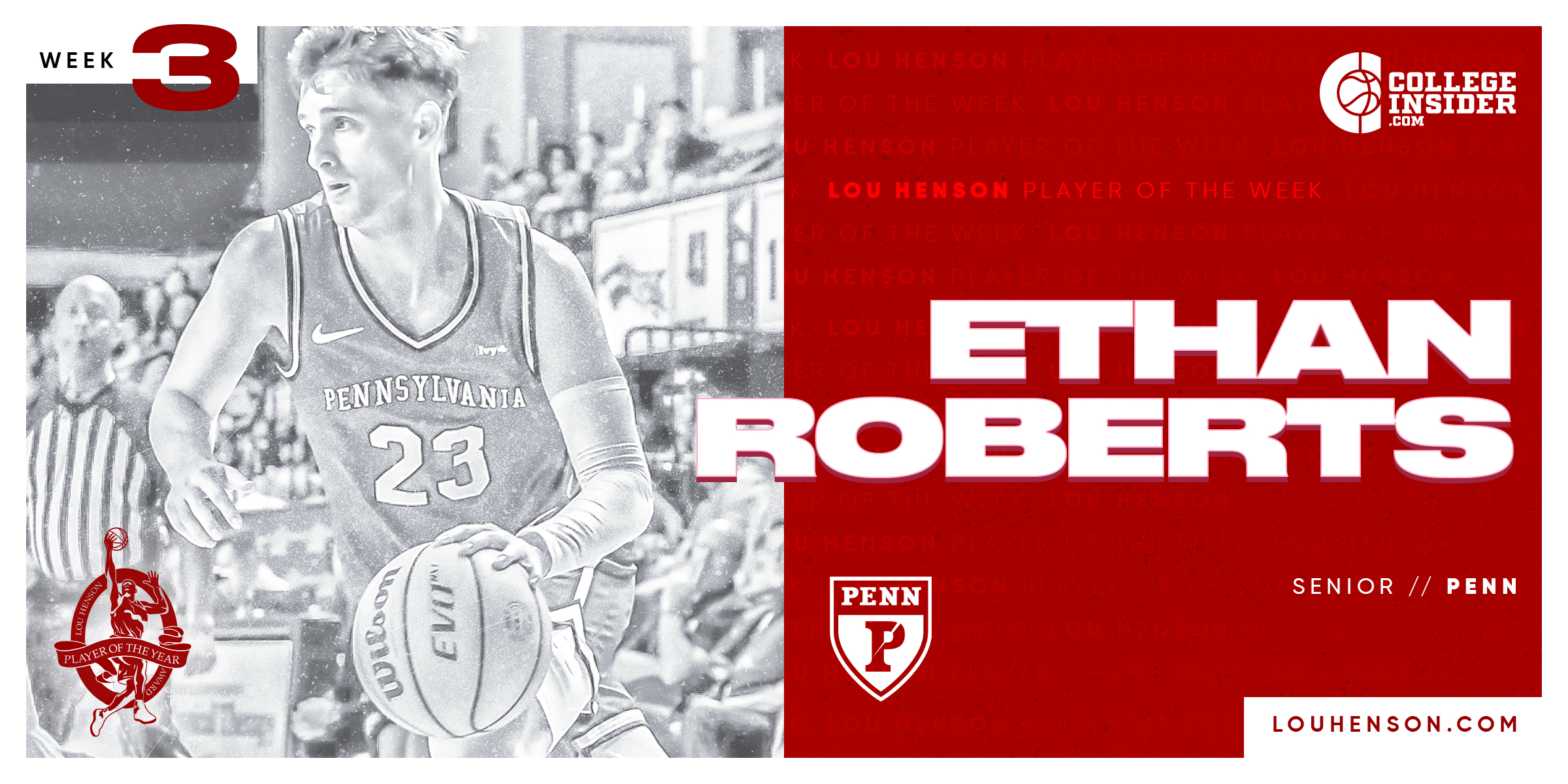 BOSTON, MA -- Penn’s Ethan Roberts has been named the Lou Henson award National Player of the Week. The 6-foot-5 senior led the Quakers to a pair of wins last week.