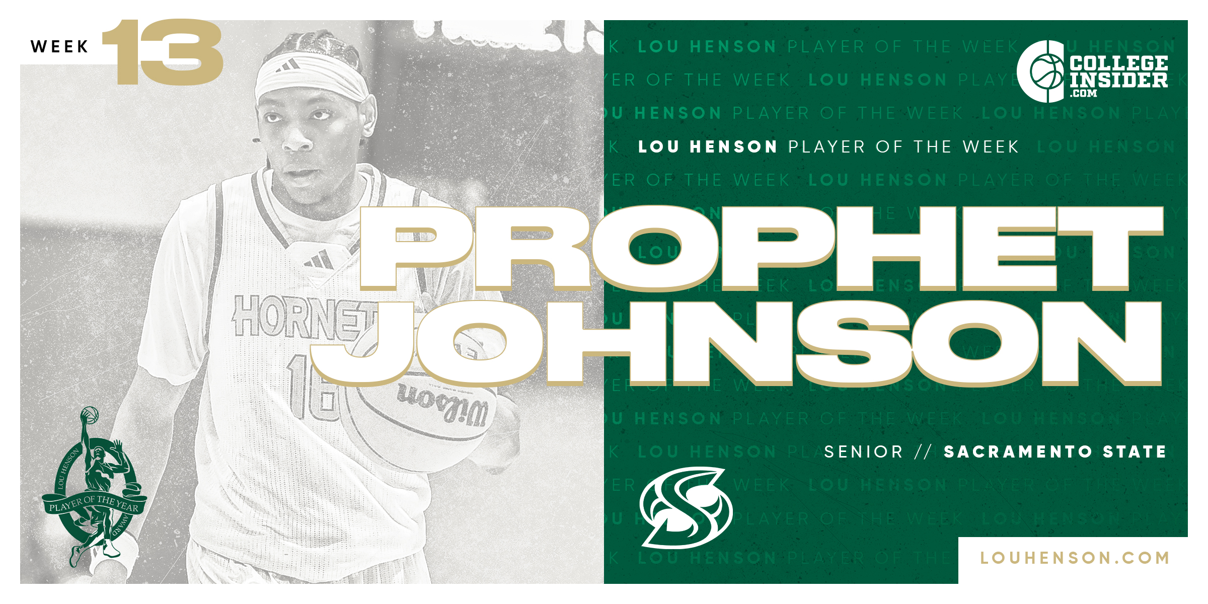 BOSTON, MA -- Sacramento State’s Prophet Johnson has been named the Lou Henson award National Player of the Week. The 6-foot-3 senior led the Hornets to a pair of conference wins last week.