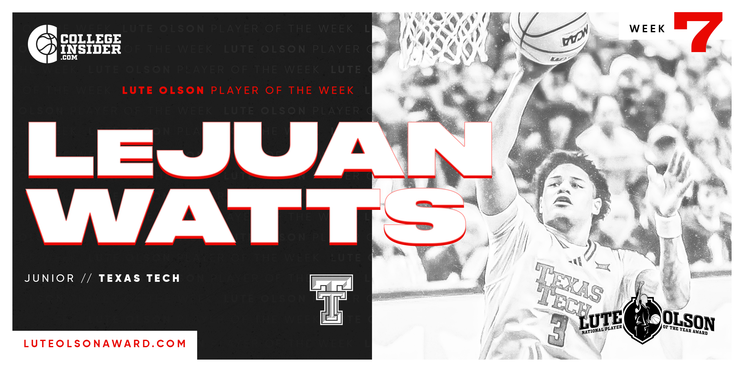 BOSTON, MA -- Texas Tech’s LeJuan Watts has been named the Lute Olson award National Player of the Week. The 6-foot-6 junior helped the Red Raiders to a pair of wins last week.