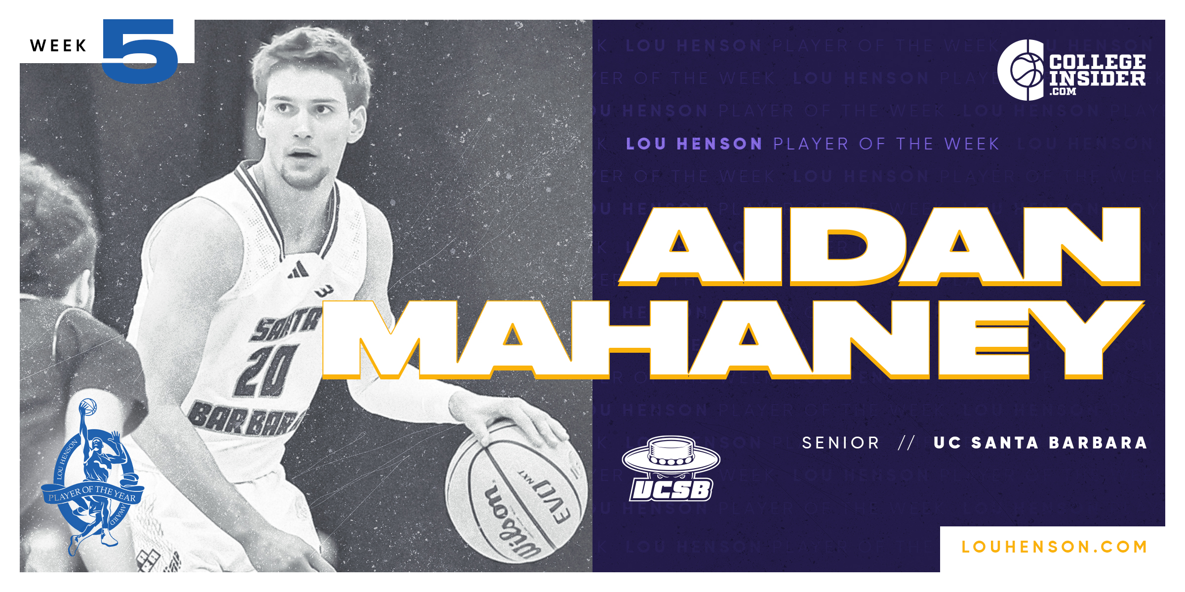 BOSTON, MA -- UC Santa Barbara’s Aidan Mahaney has been named the Lou Henson award National Player of the Week. The 6-foot-3 senior led the Gauchos to a pair of wins last week.